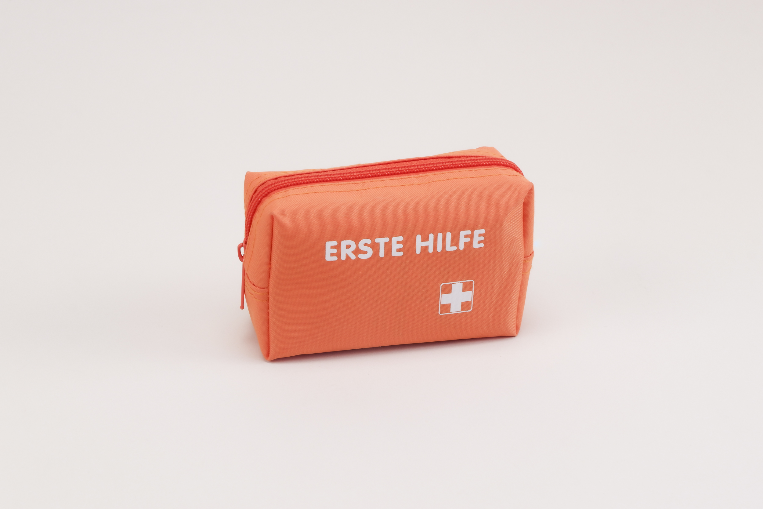 Nylontasche 70D, orange mit weiß-blauem Aufdruck, ausgesuchtem Inhalt,